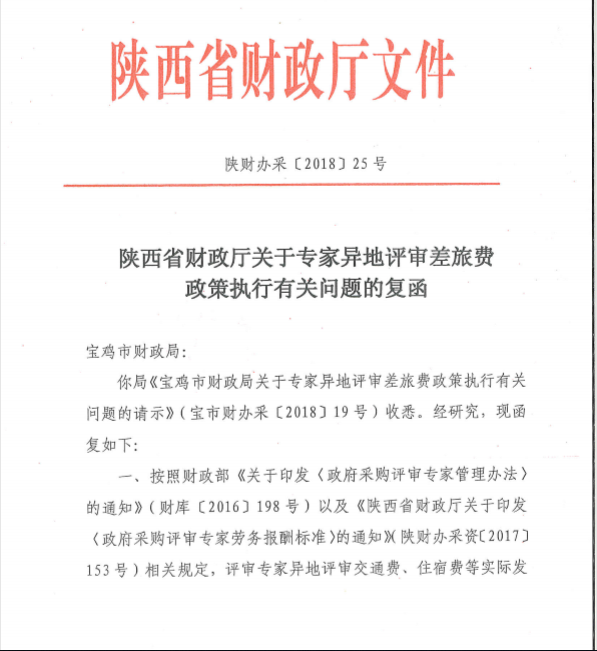 陕西省财政厅关于专家异地评审差旅费政策执行有关问题的复函