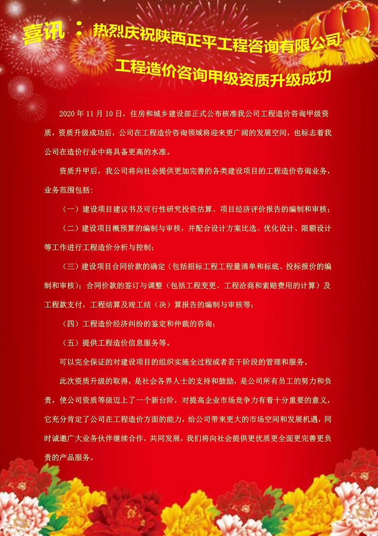 喜讯:热烈庆祝陕西正平工程咨询有限公司工程造价咨询甲级资质升级成功